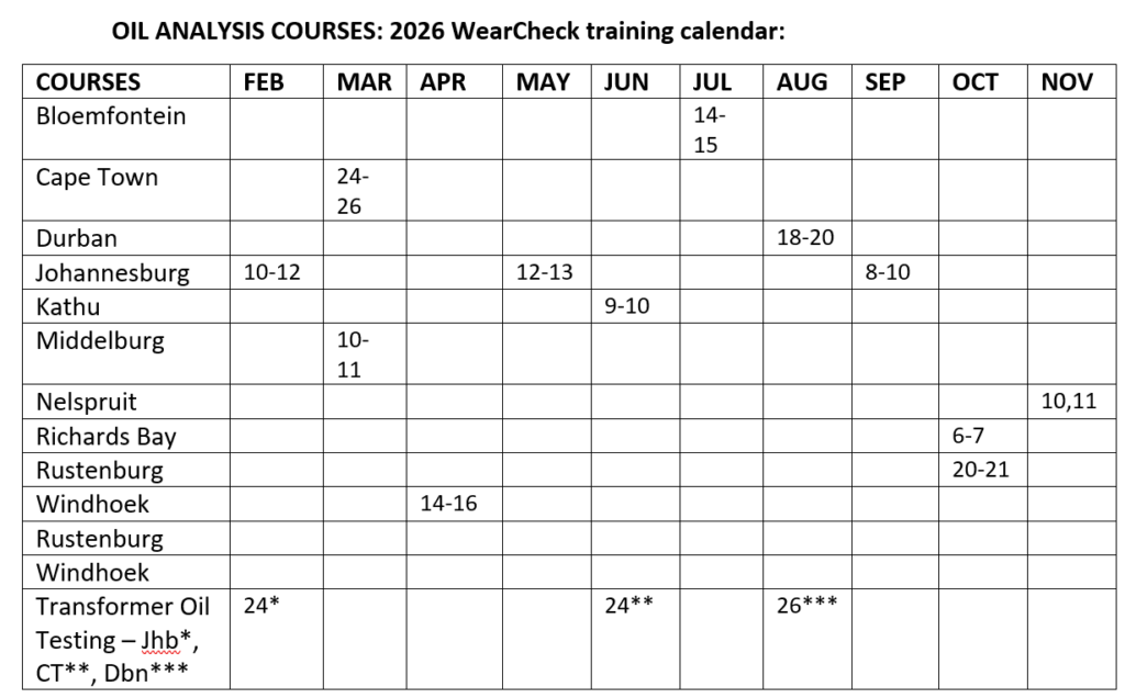 To book an oil analysis course, contact Michelle van Dyk on training@wearcheck.co.za or call 082 381-3321. Visit https://www.wearcheck.co.za/training/wearcheck-training.html