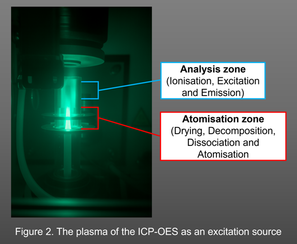 The sample aerosol flows into the atomisation zone where drying, decomposition and atomisation occur. These atoms then flow into the analytical zone where they are ionised (Figure 2) and excited as the electrons in the atoms absorb energy and reach a higher energy state.